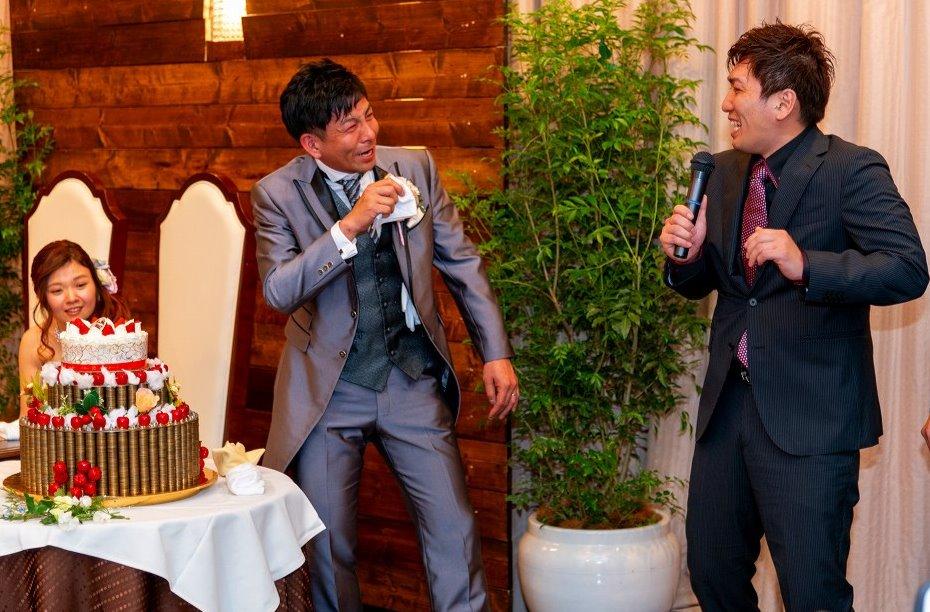 演出については、特に何も考えておりませんでしたが、サプライズで新郎・新婦の友人にケーキバイトしてもらったり等、簡単なことしかしませんでした。しかし…余興も何も考えていなかったのに、スクリーンに新婦友人達からのお祝いビデオレターが、新郎友人達からはご祝儀?として、五円玉で製作されたケーキが登場したりと、本来、私たちが精一杯のおもてなしをする側なのに…本当に感動と感謝しかありませんでした。