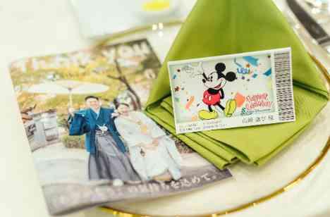大好きなキャラクターが入っている席札にプロフィールブックも全て手作り。表紙には和装で前撮りされた時のお写真を使用し中のページには席次表やドレスでセルフ前撮りをされた時のお写真などを入れられました!おふたりらしい最高の笑顔がチャームポイントのプロフィールブック。とても可愛いアイテムにゲストの方も思わずお写真をたくさん撮っておられました。
