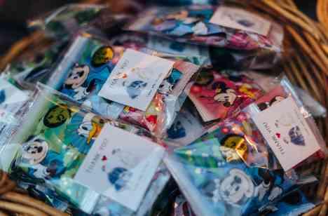 プチギフトは大好きなキャラクターのお菓子と似顔絵ステッカー!ステッカーに描かれている似顔絵ははご友人様におふたりの前撮りのお写真をもとにイラスト風に描いていただいたものなんです。携帯のカバーの後ろにもはさめるようにと少し小さめサイズでご用意されました。おふたりらしさが溢れるプチギフトにゲストの方もすごく喜ばれておりました。