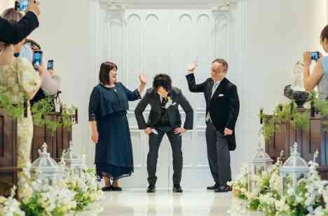 新郎様の入場では、お母様からジャケットを羽織らせていただき身支度を整えていただく、ジャケットセレモニーでした。お父様からは、これからの結婚生活に向けて、応援の『喝』を入れていただく為、背中に気合を注入いただきました。その瞬間のお写真です。チャペルに『バーン』の音が鳴り響き、お父様の愛情の大きさがゲストにも伝わり、大盛り上がりから人前式が始まりました。