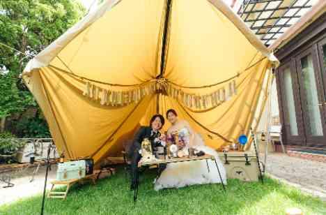 ガーデンにはお二人が愛用している、テントを飾り、大好きな小物たちでコーディネート。ガーデンでのビアパーティーも、スイーツブッフェの時間も、ゲストみんなが思い思いに写真を撮るフォトブースになっておりました。披露宴ではゲストみんなとの会話ができる時間を取りたいとの希望でしたので歓談を中心として、なるべくメインテーブルに2人が座りっぱなしにならないように進行を考えました。