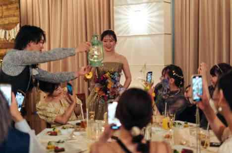 お色直し入場は、新郎様が大好きなヒップホップでサングラスをかけてお一人で入場し、新婦様を迎えにいく演出。2人が揃ったら、各テーブルにご挨拶回り。そんな演出にはキャンドルに火を灯すのではなく、キャンプテイストがをとりいれた、ランタンに火を灯しました。ランタンに灯した明かりでテーブルコーディネートが更に、写真映えする空間になり、会場中が華やかになりました。