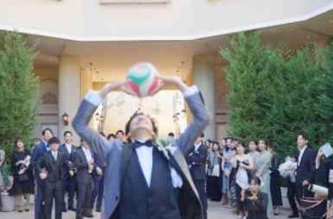 学生時代から今も社会人でバレーボールをするほど、バレーボールを愛してやまない新郎様による、幸せのおすそ分けトス! 無事に成功!そのボールには披露宴中、ゲストの皆様にご協力いただき、寄せ書きとしてたくさんのメッセージを書いていただきました! お二人も仕上がりに大喜びで、現在は家の玄関に飾っているようです!
