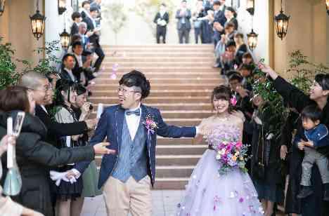 お二人はディズニー好き、その中でもラプンツェルがお好きだったので、そこで出逢ったのが薄い紫色のラプンツェルドレス!そして新郎もラプンツェルのタキシードでフラワーシャワーで皆様から祝福を受けていらっしゃいました。