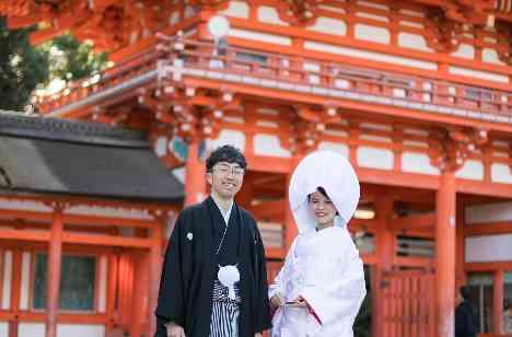 下賀茂神社がお好きなお二人でしたので、結婚式するなら下賀茂神社で挙式!と決めておられたので夢を叶えられました。下賀茂神社での挙式後は、敷地内で写真撮影に30分。たくさんの親族と友人に囲まれて笑顔がいっぱいでした。