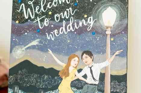 新婦様のお姉様が、新郎新婦様のために時間をかけて描いてくださったウェルカムボード♪ 映画「ラ・ラ・ランド」をイメージして、その世界観を描いてくださいました! そのため、当日の披露宴入場BGMは映画「ラ・ラ・ランド」といえばあの曲!というBGMをチョイス♪ どのタイミングで入場するか、とても悩んでプランナーと3人で時間をかけて決めましたね!