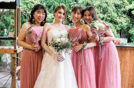 新婦様のご友人様は全員お揃いのドレスを着てブライズメイドに♪ そんなご友人様のために、当日新婦様からは、新婦様がお持ちのブーケと同じような雰囲気のブーケを全員にサプライズプレゼント! 挙式後のガーデンパーティでは、緑に囲まれた空間の中で皆様とたくさんお写真を撮ってくださっておりました! カジュアルな結婚式にはピッタリです★