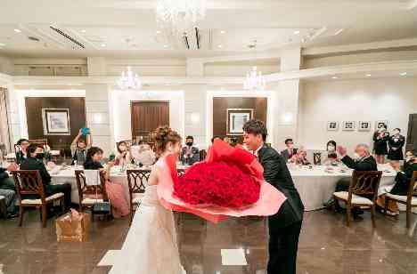 会食パーティも終盤にさしかかり、もうそろそろお開きとなる前に、新郎様から新婦様へサプライズをご用意しました♡ ご用意くださったのは大きなバラの花束と、プレゼント、そしてお手紙…。 コロナウイルスの関係で、当初予定していた結婚式が出来なくなり、今日に至るまで色々なことがありました。 それでも、これからも変わらず愛情を注いでいくという新郎様の熱い想いが伝わり、会場中が温かい雰囲気になりましたね!