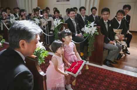 大聖堂ならではの王道で厳かな挙式を執り行いました 式の始まりを告げるトランペットの重厚な音色、ソプラノ歌手の讃美歌、本物のパイプオルガンによる数々の美しい音楽が、おふたりの誓いを彩ります その中でも指輪交換のシーンにおふたりの姪っ子ちゃんが指輪を届けてくれる リングベアラーの場面ではゲストの皆様の笑顔が溢れるほっこりとしたお時間となりました