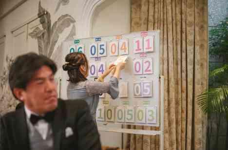 披露宴会場に用意されたたくさんの得点板 各テーブル対抗で様々なミニゲームや演出へ参加して頂き、披露宴中はたくさんのポイント集めをおこなっていきます 会場内のスタッフとゲスト皆様の間でたくさんの交流がうまれるのも魅力のひとつでした 最終的に優勝し豪華景品を獲得するテーブルはどこなのか 白熱する戦いが繰り広げられました