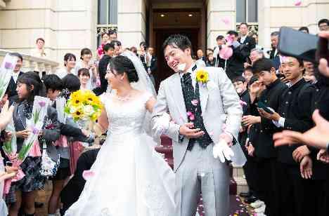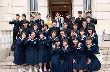 披露宴に参加するゲストの皆様に加え、おふたりの教え子である生徒さんも参加。総勢100名を超える大切な方々からの祝福におふたりの弾ける笑顔。フラワーシャワーの後はプレゼントトスや生徒さんとのフォトタイム。 結婚式を間近で初めて見る生徒さんの喜ぶ姿。おふたりへの大歓声。素晴らしい先生として日々お仕事をされている様子が伝わりました。