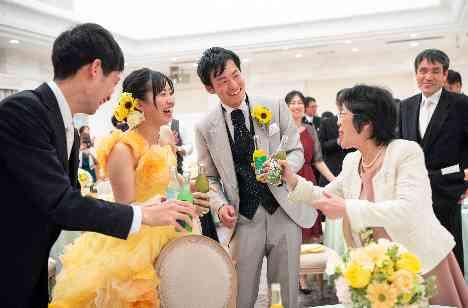 披露宴前半では生徒さん達からのサプライズで 新郎新婦様に祝福のダンスを披露。 急遽新郎様も参加したパフォーマンスに会場は大盛り上がり。パーティー後半は新郎様が生ビールを、新婦様がおつまみをゲストの方ひとりひとりに振る舞う演出も。ゲストと過ごす時間を大切にするおふたりのパーティーのクライマックスは「ワンモアチアーズ」で退場。おふたりからの感謝とゲストの方からの祝福の想いを乾杯に込めて届けました。