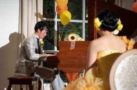 披露宴後にパーティー会場で新郎様からのサプライズ。 グランドピアノで新婦様のブーケでもあり大好きなヒマワリにちなんで「ひまわりの約束」を伴奏。一番感謝を伝えたい人へのメッセージをピアノの演奏で届けました。大喜びする新婦様のご様子を見てサプライズ作戦の大成功を確信しました。
