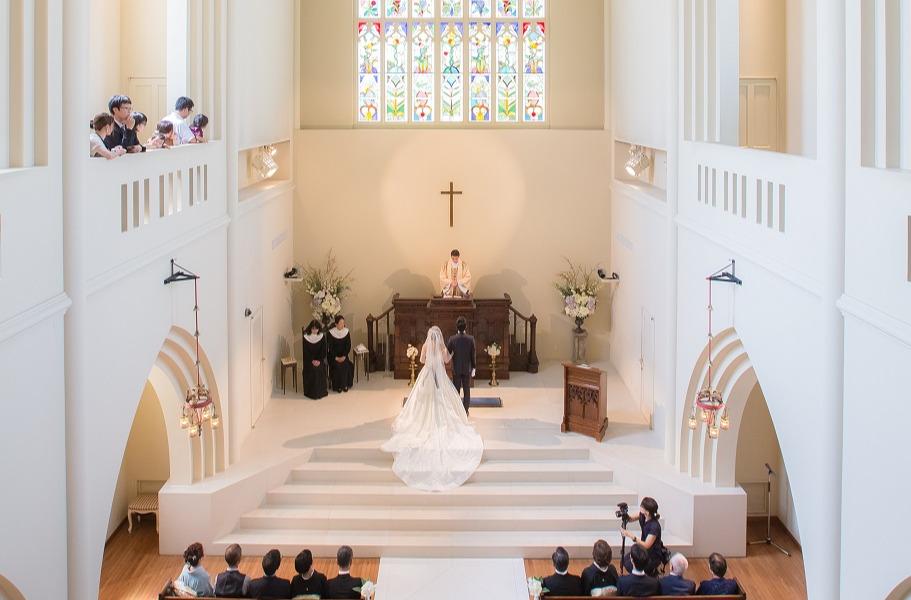 挙式をするならここでと決めていた新婦様。広さ・高さ県下最大級の大聖堂は150名の列席も容易に収容可能。2階席もあり、大勢のゲストの方の祝福に包まれる中で、迫力あるパイプオルガンとトランペットの生演奏。 大聖堂でのセレモニーはおふたりにとって一生忘れられない1日になったことと思います。