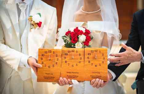 贈呈品に三連時計をプレゼントしました! 一本の木の木目からできた三連時計は 互いの両親と新しくうまれた私たち家族の 3つの時計を合わせることでこれからも永遠と続く 家族のつながりを感じることができました