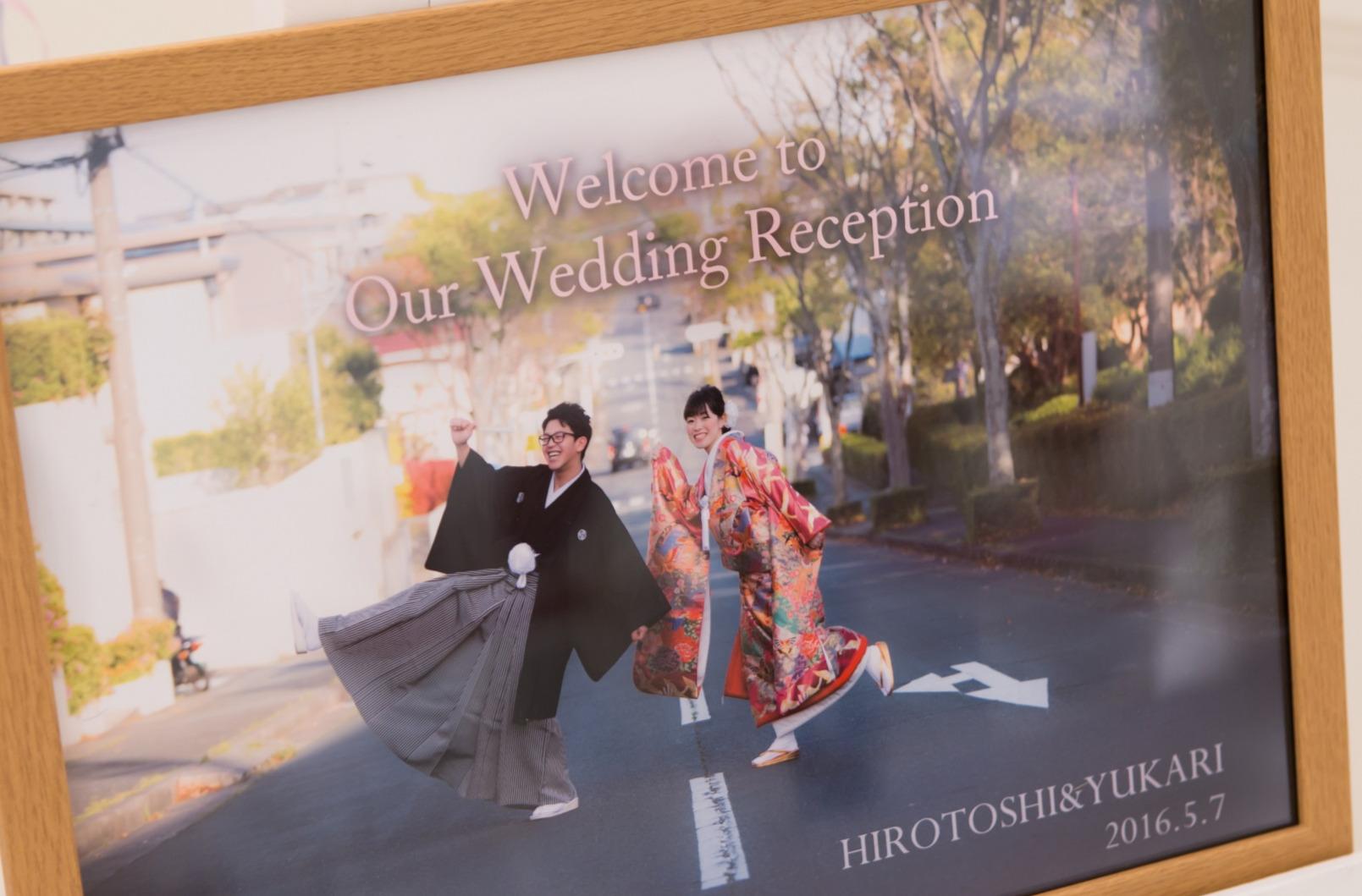 「せっかくやるなら楽しく」といただいたお言葉を胸に、結婚式のご提案を致しました。 和装でのロケーションフォトでは、道路を渡る陽気なポーズで写真撮影。その写真で作成したウェルカムボードは「おふたりらしい」とゲストからも好評でした。