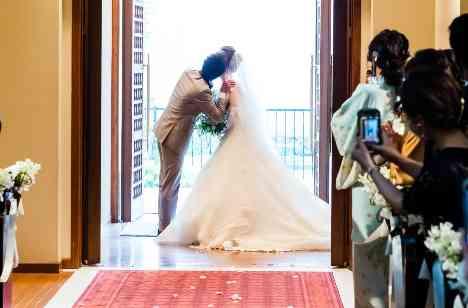 挙式はアビー・チャーチにて教会式。チャペルの扉を開けるとすぐに外に繋がります。青空を背景に、退場のタイミングでクロージングキス。そしてゆっくりと扉が閉まります。 挙式の後は階段を降りて青空の下アフターセレモニー。ブーケトスや集合写真、ここではゲストの皆様と近い距離でフォトタイムや歓談の時間を過ごされました。