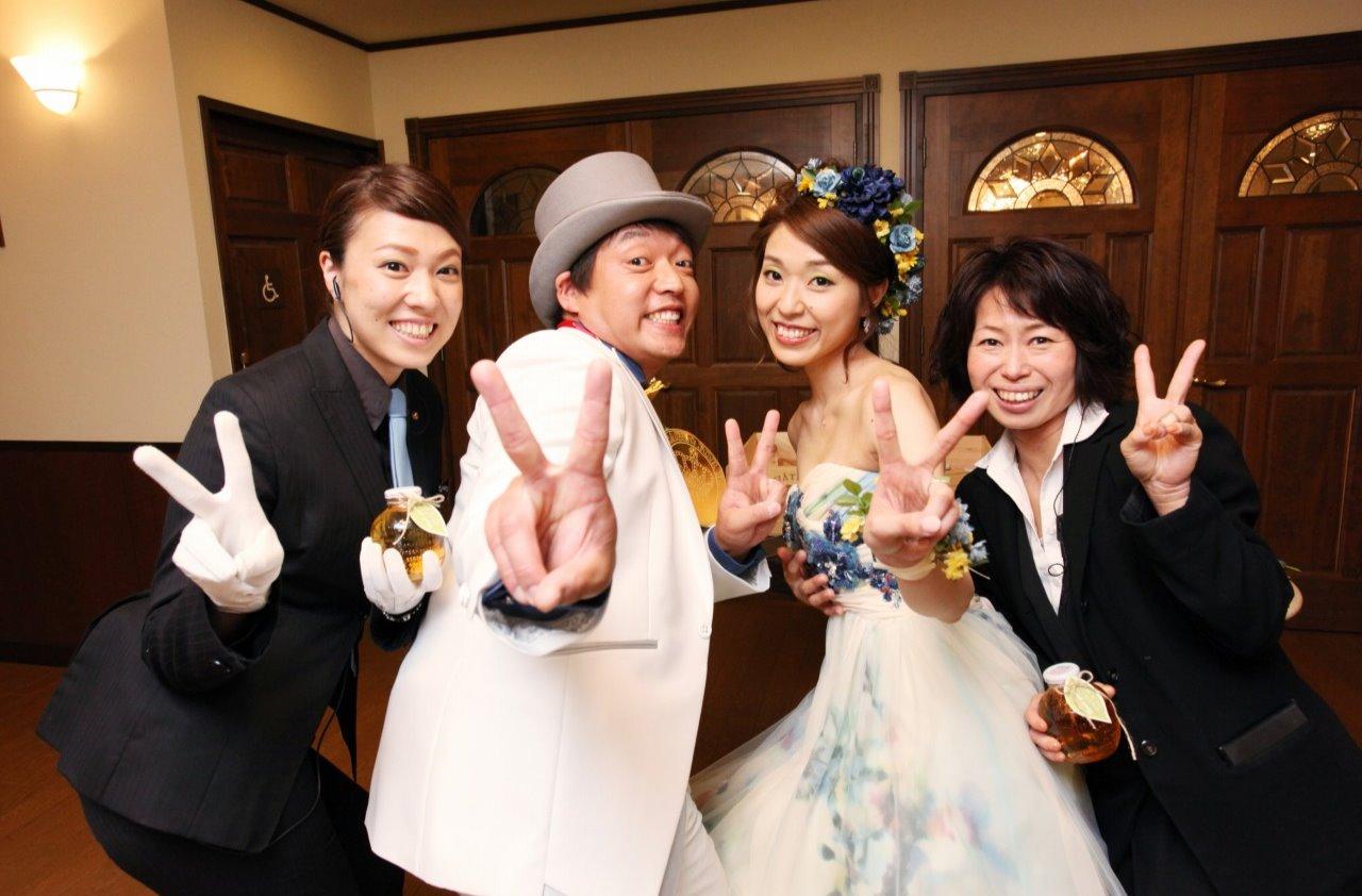 「私たちらしくて明るく楽しい結婚式に」というふたりの想いを受けとめ、形にしてくれたプランナー&スタッフたち。いつも気さくに声をかけてくれる優しさが心にしみたという。「希望のイメージにぴったりのカラードレスを用意してくださって感激!彼とポイントカラーを合わせて着こなせたのも嬉しかったです」と新婦。