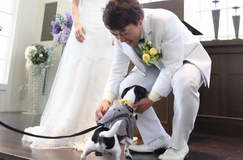 当日は見事な晴天!自然光が眩しく差し込むシャトーに愛犬もリングドッグとして参加し、結婚証明書に肉球スタンプを押す大役を果たした。ブライズメイドたちに誓いの言葉を問いかけてもらって挙式が成立し、明るい音楽が流れる中ノリノリで退場。外でのフラワーシャワーでは、友人たちによる金銀テープのクラッカーも!