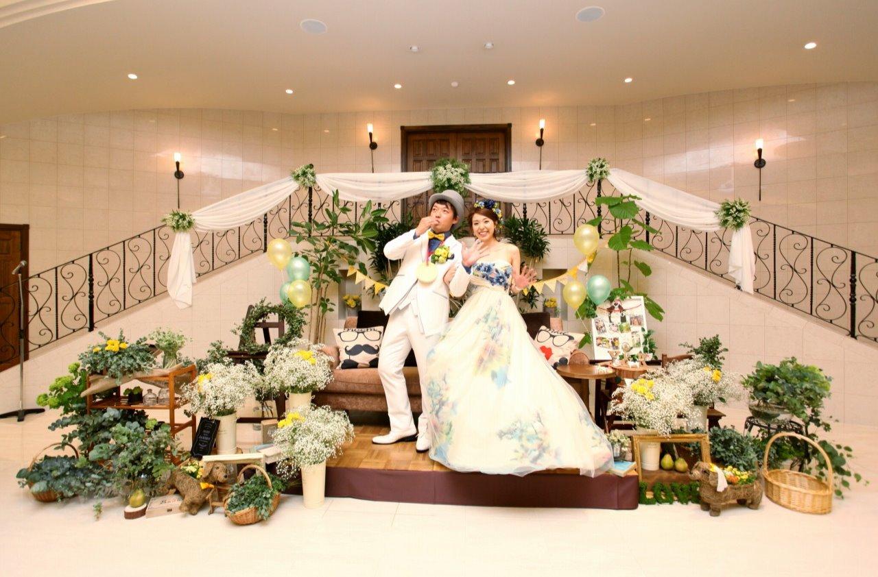 白を基調とした、開放感あふれる空間でのパーティ。ソファスタイルのメイン席周りに緑の木々や白い花をたくさん飾り、黄色をアクセントカラーにして明るく元気な印象に。「ビアサーバーを担いで新鮮なビールを注いで回り、ケーキでなく特製の『骨付き肉』に入刀するなど、やってみたい演出がたくさん実現しました」と新郎。