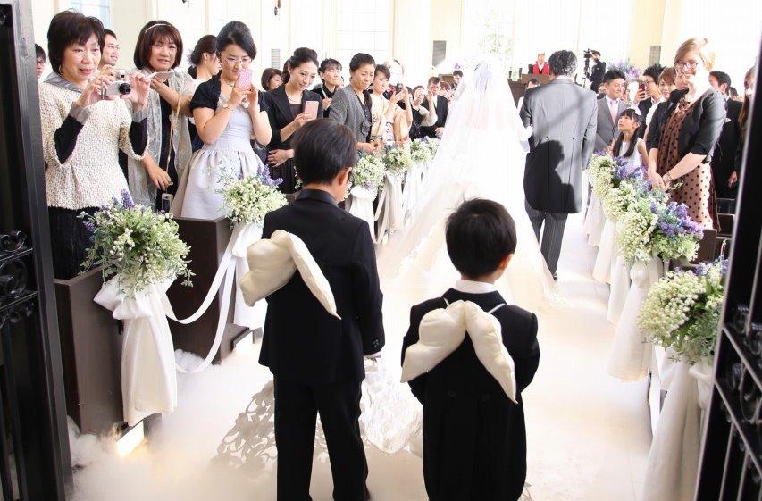 秋の陽射しに輝くチャペルでの教会式。新婦は純白のドレスに憧れのロングトレーンをなびかせ、天使の羽をつけたトレーンベアラー達と共に入場。足元にシルキーミストが沸き、雲の上を歩くような幻想的なシーンに。挙式では新婦のヴァイオリン&聖歌隊による【Amazing Grace】の曲も美しく響き、人々の間に感動が広がった。