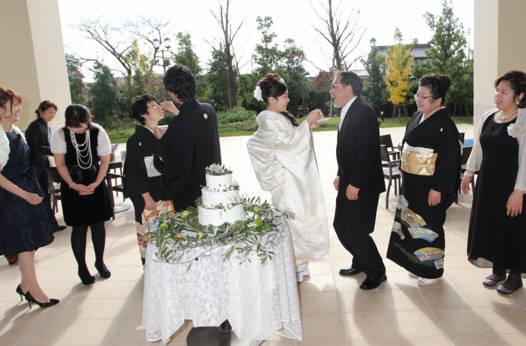 白いテラスが広がる全天候型のガーデンに面し、空と緑を感じるパーティ会場。メイン席には新婦の実家のシンボルツリーであるオリーブを始め、アイビーやミモザなどの植物を飾り、まるでお庭のような空間に。和装で入場した後はガーデンでケーキ入刀&ファーストバイト。お世話になった人達にサンクスバイトで感謝を伝えた。