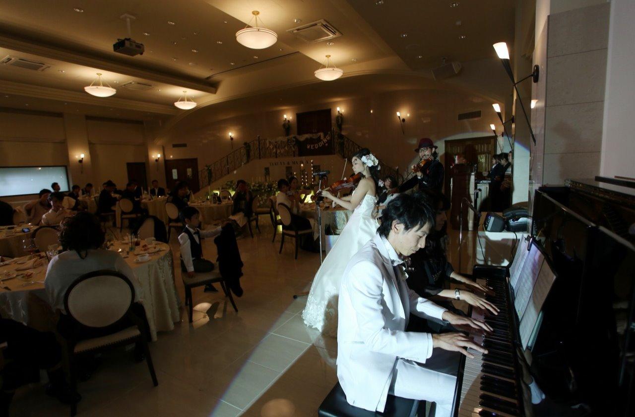 各卓でのキャンドルサービスの後は、新婦&師匠がヴァイオリンを弾き、新郎&師匠夫人がピアノを奏でるという、夢のコラボ演奏が実現。いつしか手拍子も起こり、ライブ会場のような熱気に包まれた。さらに、ガーデンにデザートビュッフェも登場!「私達からオリジナルのアイスを振る舞い、写真タイムも楽しみましたよ」。
