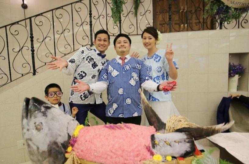 ケーキの代わりにマグロ入刀!ご新婦様の地元、焼津のマグロ屋さんの友人とコラボした企画。プランナーやシェフと共に試行錯誤して、大迫力のマグロ船盛に仕上げました!!焼津の名物、「魚河岸シャツ」を着てのマグロネギトロ入刀は、会場が大盛り上がりとなりました!!その後はゲストの皆さまへ「ネギトロご飯」としてふるまい、こちらも大好評でした♪*