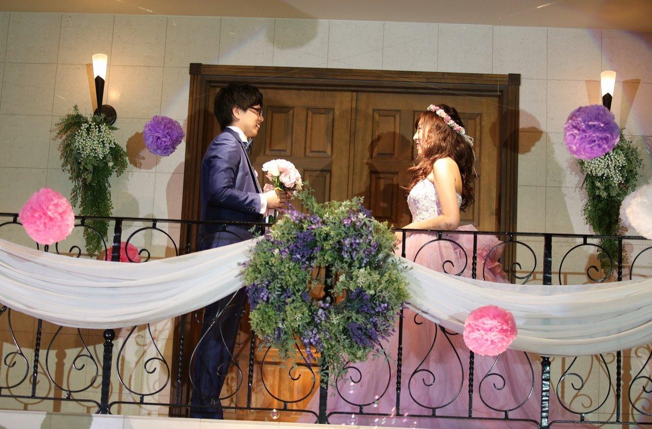 プロフィールDVDの上映後、1階フロアの扉から新郎のみが入場。各卓を回って花を集めて花束にし、メイン席上のバルコニーから現れた新婦にプロポーズ!「会場から温かな歓声が沸き、大切な彼女にあらためて気持ちを伝えることができました。彼女と音楽仲間によるアンサンブルの演奏も、すごく心に響きました」と新郎。