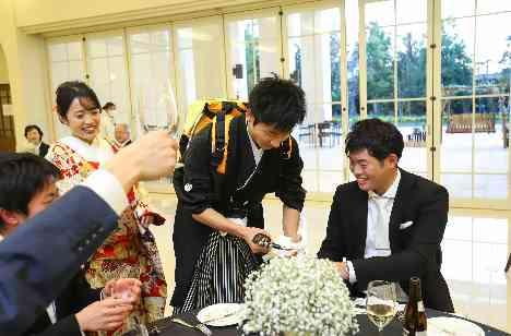 お色直し後のテーブルラウンドはビアサーバーを背負った新郎様よりビールのおもてなしを♪感謝を伝えながら一人ずつお酌される姿が印象的でした。新婦様からはウーロン茶のサービスもされ、和やかなひとときをお過ごしになられました★