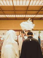 花嫁行列が向かう先は八勝館で一番高い場所に位置する「菊の間」、神様に一番近いお部屋で厳かな式が執り行われます。 お二人を向かい入れるのは雅楽の音色、三々九度による契りの儀式、巫女による舞の奉納など。神前式・人前式どちらも対応可能でございます。