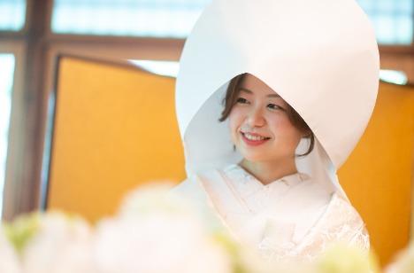 御幸の間で挙式を迎えられたおふたり。真っ白な綿帽子がお庭からの自然光を取り込み、新婦さまの柔らかな表情をふわりと包みこむ一枚。目線の先には乾杯のご発声をされるお父様の姿が。庭を背景にゲストの方々と一人一人、記念の写真を残されました。お二人のご希望通り、ゲストの方々とゆっくりした空間を作られていました。