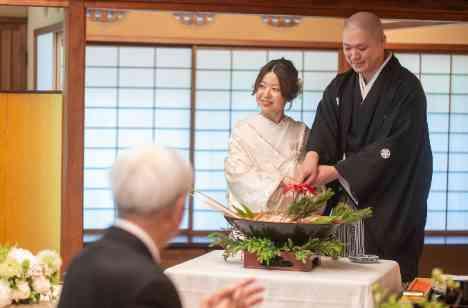 八勝館伝統の婚礼料理【はらみ鯛】に入刀