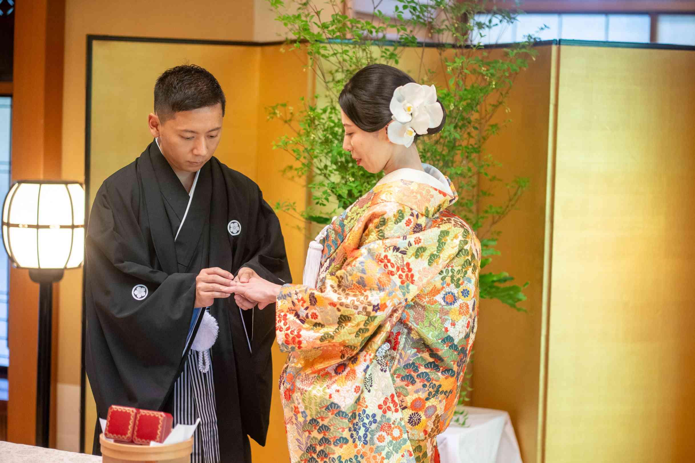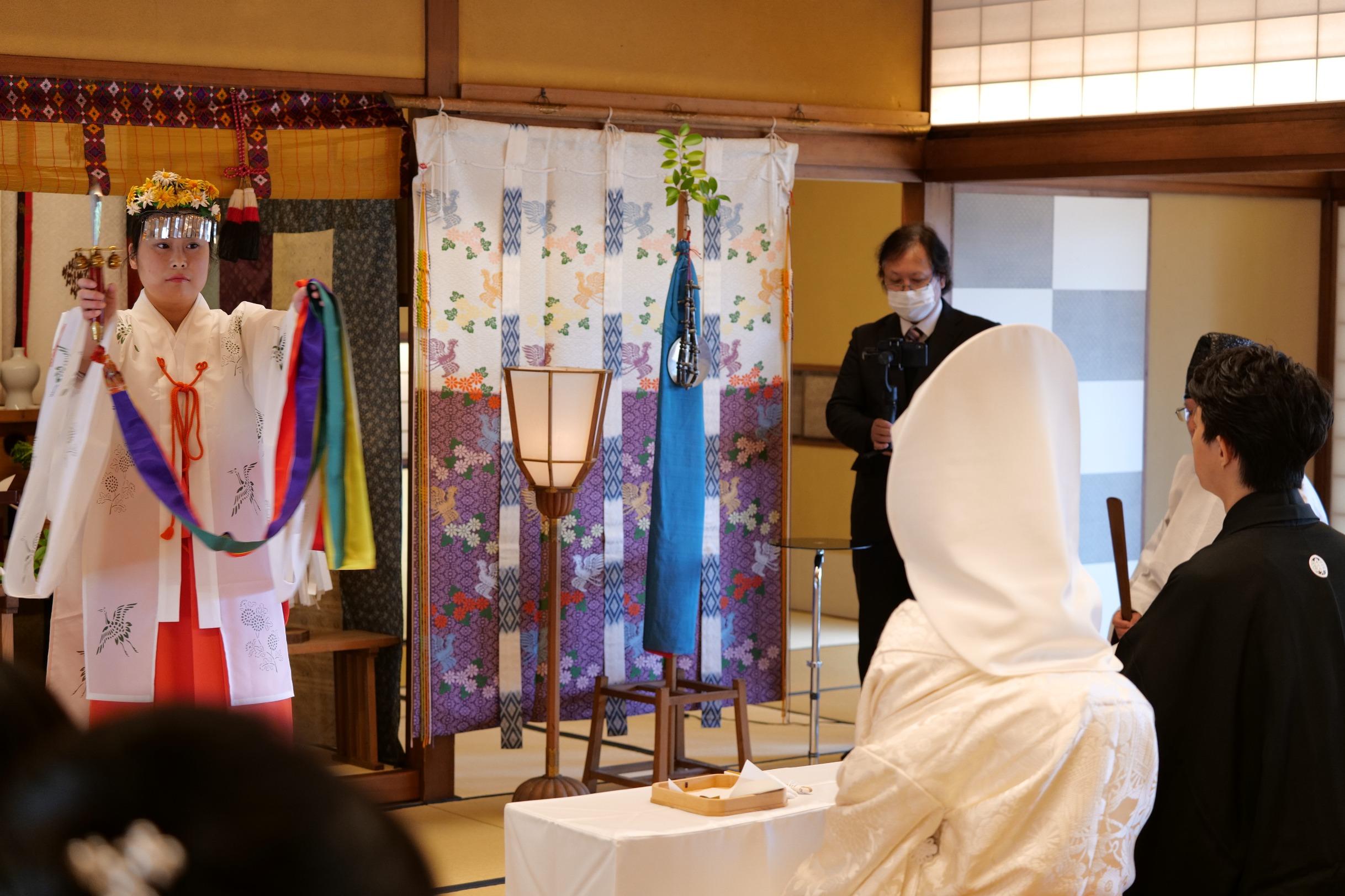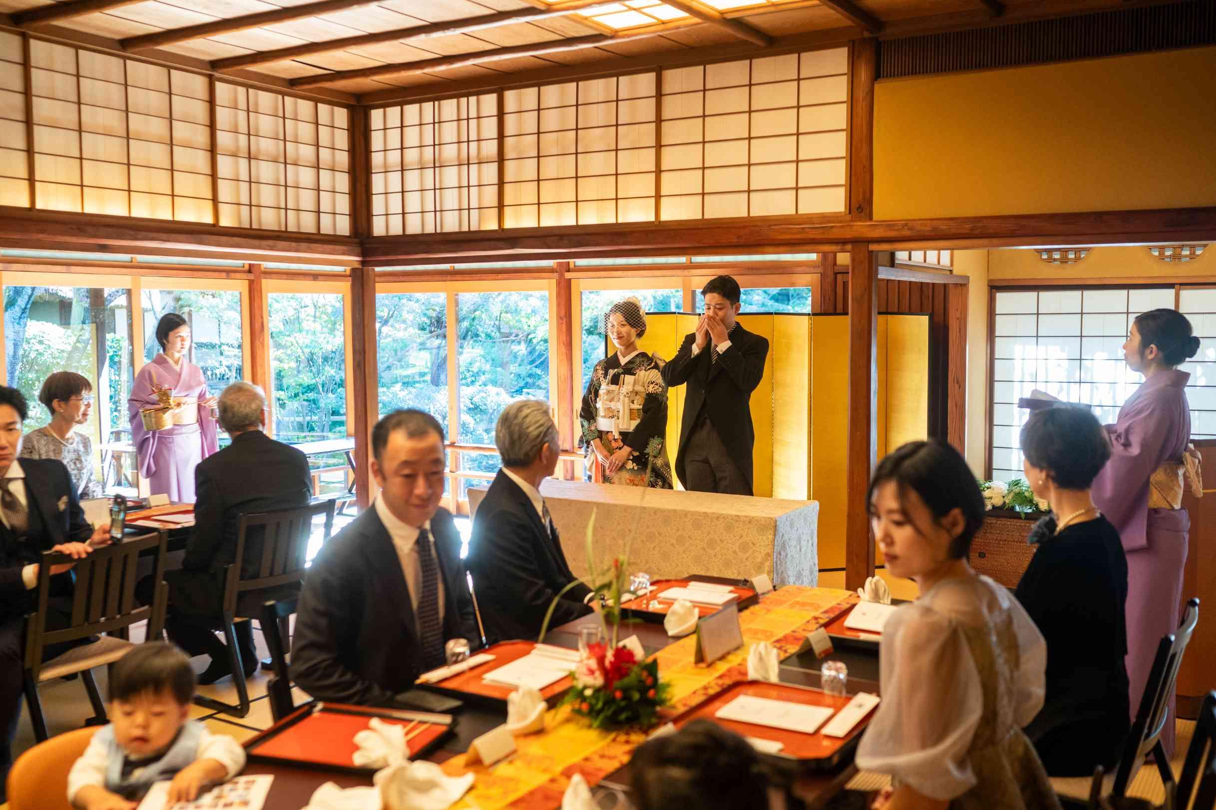 二人が神前で結婚の報告を行う神前式は、八勝館で一番神様に近いお部屋『菊の間』にて行います。 巻物におふたりの誓いを書いて皆様にご承認いただく人前式は、お人数様に合わせた披露宴会場にて。