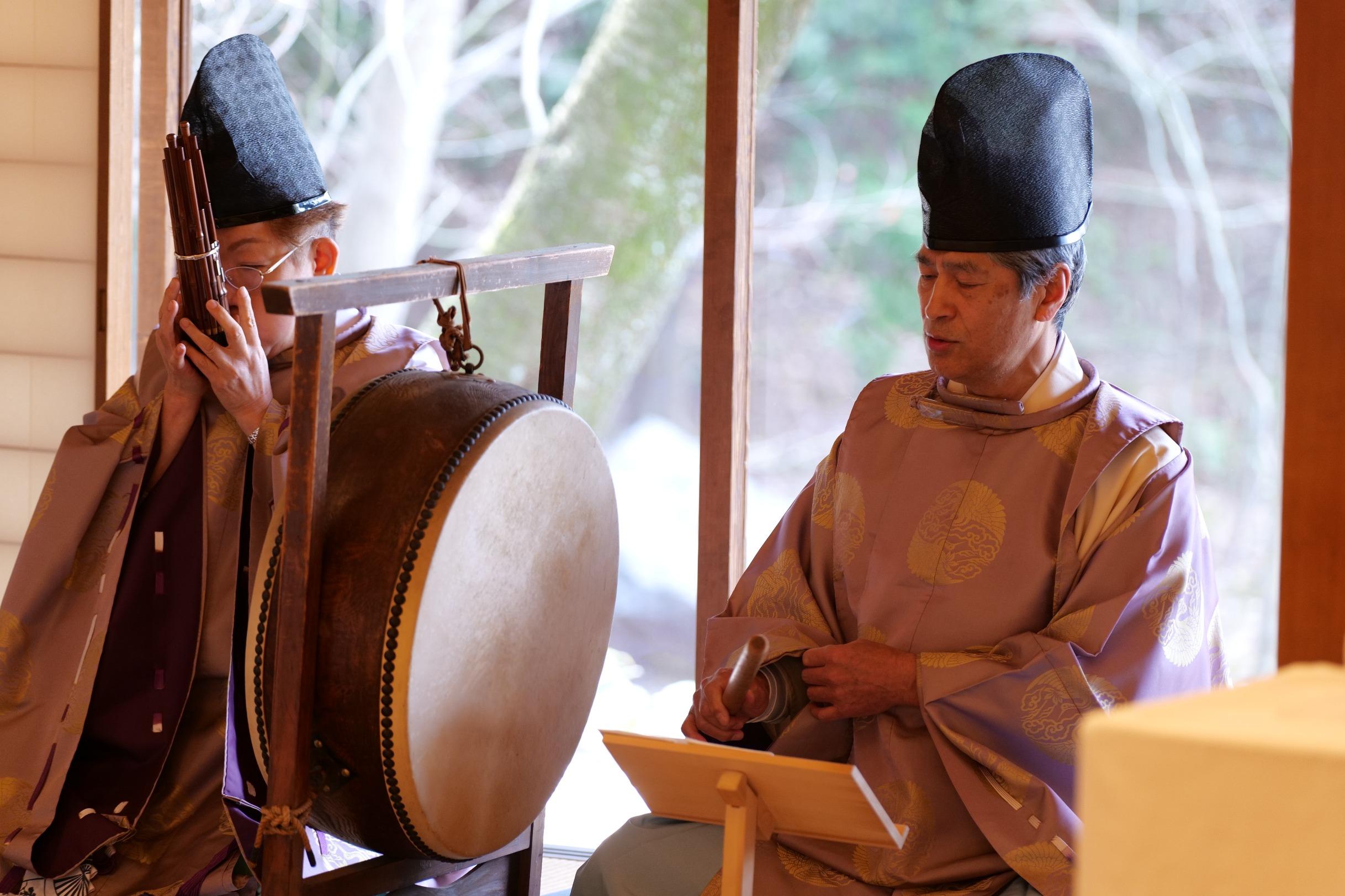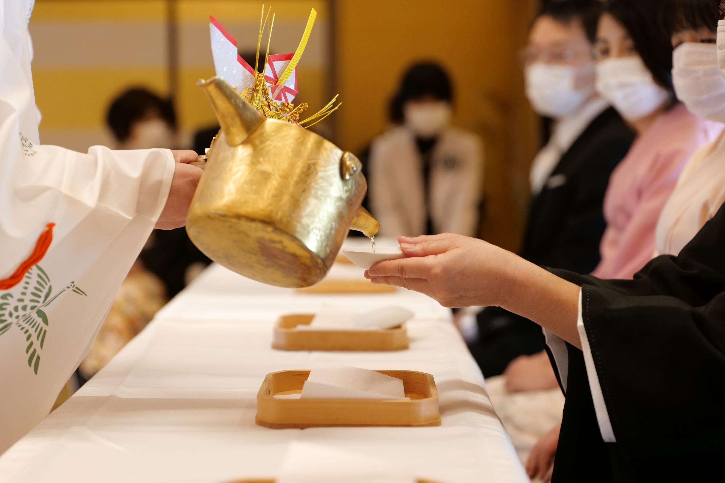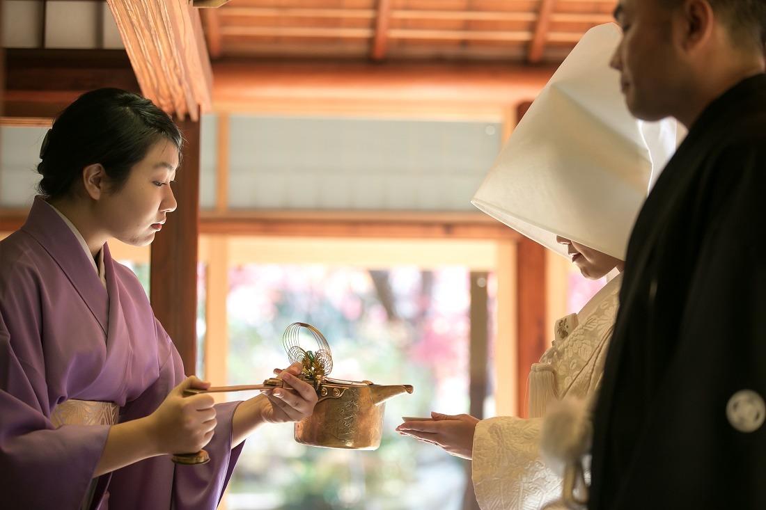 二人が神前で結婚の報告を行う神前式は、八勝館で一番神様に近いお部屋『菊の間』にて行います。 巻物におふたりの誓いを書いて皆様にご承認いただく人前式は、お人数様に合わせた披露宴会場にて。