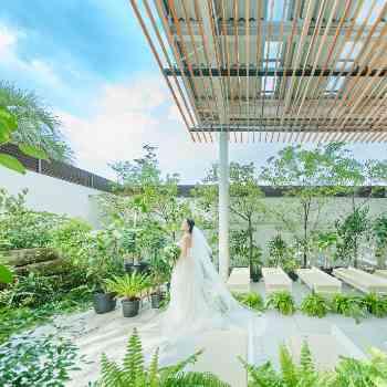 開放的な空間が印象的なテラスはパーティ会場と行き来が自由。リゾートフルな空間での挙式はもちろん、フォトブースを用意したり、ナイトタイムにはキャンドルやランタンを飾るなど、オリジナリティ溢れる一日に。