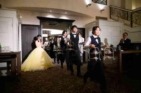 コース料理も進み、いよいよデザートタイム。おふたりが扉を開けるのを合図に音楽がかかり、披露宴会場には、デザートタワーを持ったスタッフが入ってきました。ゲストの皆様、ひとりひとりに配られていく、何種類もデザートがのったタワーを見て、ゲストは大喜び。ケーキ入刀やデザートブッフェだけでなく、デザートをメインにした演出はまだまだあります。