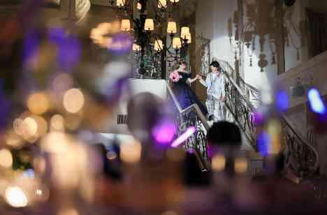 カラードレス当てをしながらの入場シーン。バルコニーにでた時の光景はまるでライブ会場です。その後の白亜の大階段入場はお顔から足の先までしっかりときれいに見えるシーンになります。ペンライトは受付時ではなくあえて中座中に配ることによりご新郎新婦様のことをしっかりと知ったうえで色を選んでいただくことができました。