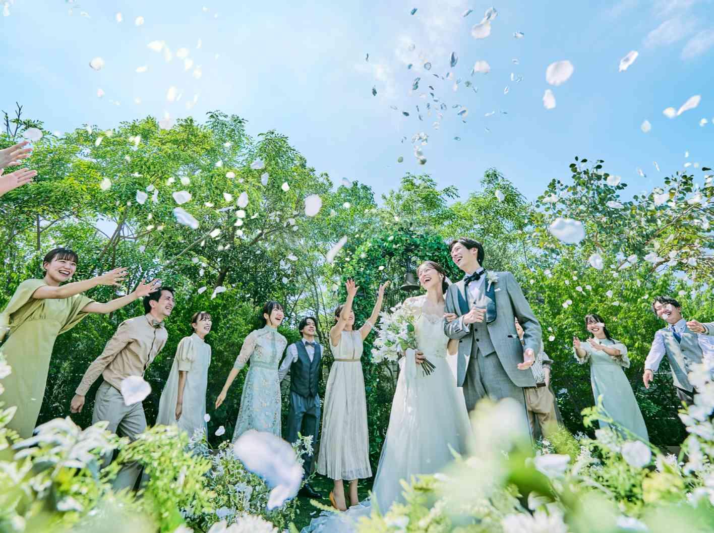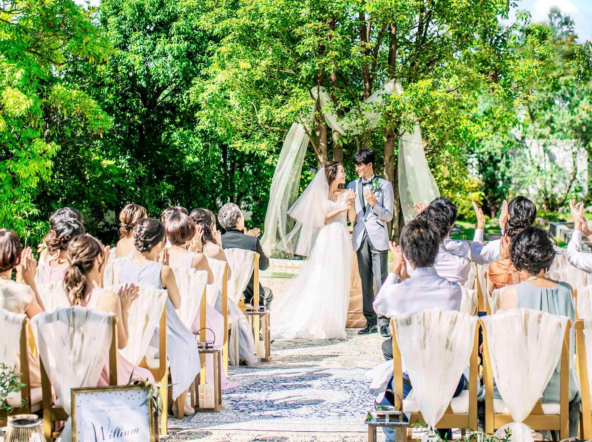 青空の下、豊かな緑と歴史的建築に包まれる「あがたの森」でのガーデンセレモニー。広大な敷地を活かした開放的な空間は、ゲストのリラックスした笑顔を引き出します。自然体でふたりらしい結婚式をしたい方へ。