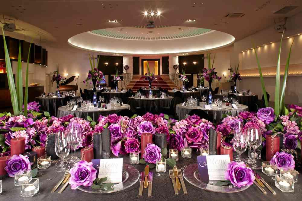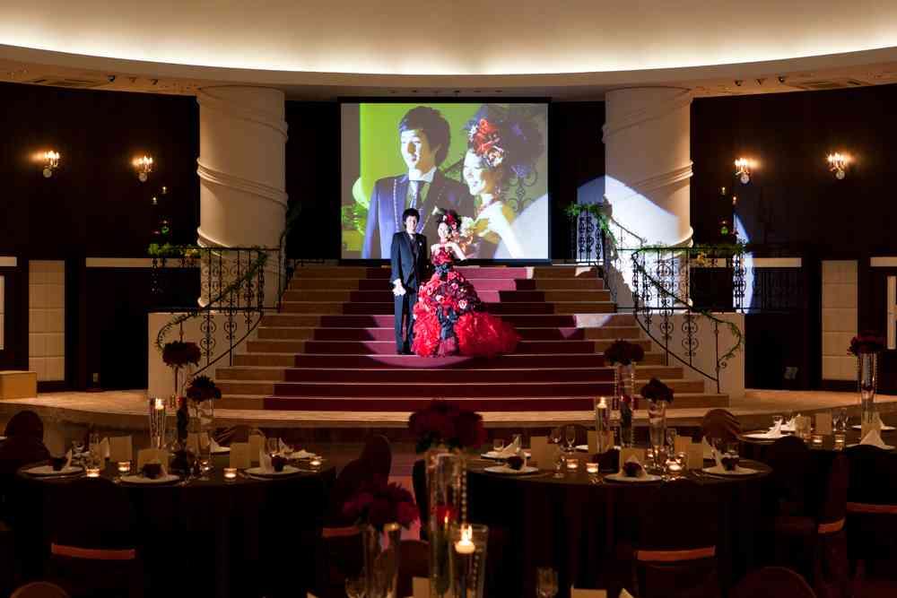重厚でスタイリッシュなインテリアが印象的な劇場型バンケット。 歌劇のトップスターのような登場ができる舞台階段や、県内唯一のゴンドラで空中からのサプライズ。 忘れられない入場シーンに。