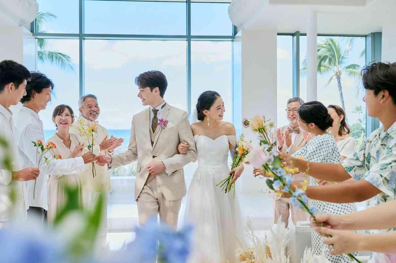 挙式後には、すぐそばきらめく海が寄り添うビーチサイドガーデンで、波音を聴きながらのレイセレモニーやケーキカットの演出を。