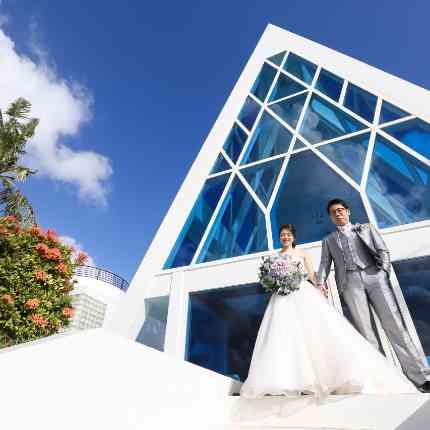 圧倒的な開放感と、一面に広がる空と海をさわやかに染めるブルーとの調和がスタイリッシュなチャペル。 挙式後はテラスに出て、大空の下で爽やかな海風を感じながら楽しむフラワーシャワーを。
