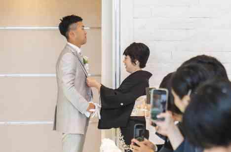 挙式の入場シーンではYukihideさんのお母様にお手伝いいただきジャケットセレモニーを。入場してすぐの場所でお母様からジャケットを着せていただきました。照れくさそうな、またちょっと思いを馳せるご表情のYukihideさん。お支度が結び、バージンロードを歩きだす新郎様を送り出す親御様の表情はとても優しく、そんなセレモニーの始まりの瞬間をゲストの皆様もあたたかく見守ってくださりました。
