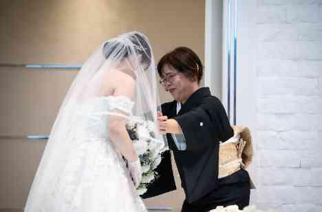 挙式本番、新婦様はお父様とお母様にエスコートされながらご入場を。花嫁の身支度ともいわれるベールダウンをお母様にお手伝いいただき、その後お父様とゆっくりバージンロードを歩まれました。花嫁の人生を表すともいわれるバージンロード。新郎様へエスコートがバトンタッチされる時間は、それぞれの想いと家族の絆が垣間見え、そして新郎新婦様の新しい未来が始まる特別な瞬間でもあります。