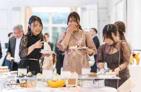 ゲストの方々へのおもてなしのひとつとして料理や飲み物にもこだわられたShuheiさんとTsubasaさん。そんなおふたりはコース料理のラストにはデザートビュッフェを…♡おふたりが扉をオープンするとその先には様々なスイーツが並んでいました♡ゲストのみなさまも談笑しながら続々と好きなデザートを選ばれ、とても大好評のご様子でした。