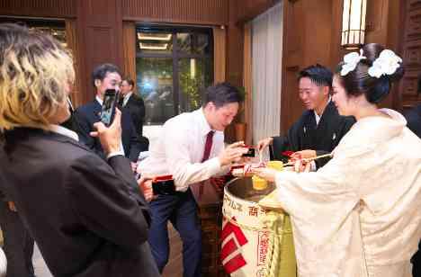 ご友人様からの元気な発声で乾杯されると、まずは新郎新婦様による鏡開きをおこないました。日本酒の入った大きな樽を新郎新婦様が一緒に開けることで、新しい門出を祝い、将来の幸せや繁栄を願う意味が込められていると言われている鏡開きの儀式。 その後はゲストの皆様にも樽酒を振る舞い、楽しく歓談も交えながら交流されている様子が見られました。
