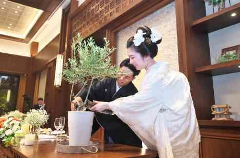 披露宴が開演する前、受付でゲストの皆様に鉢の中に土を入れるお手伝いをしていただいたオリーブの木。楽しい歓談の結びは、オリーブの木で水合わせの儀を。 オリーブの木は結婚式において「夫婦の木」とも言われる特別な植物です。溶け合い一つになるという意味がある水合わせの儀と、平和を象徴するオリーブの木を掛け合わせることで、未来永劫おふたりの生活が豊かな実りあるものになりますように…と想いを込められました。