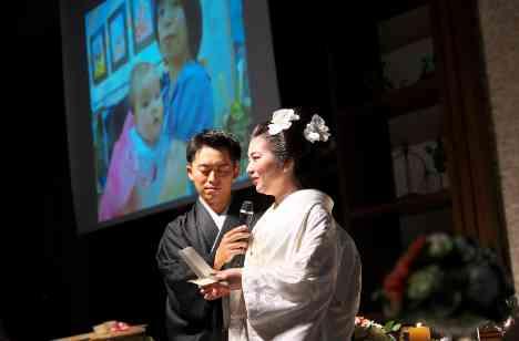 水合わせの儀を結ばれると、披露宴は新郎新婦様と親御様のお時間へ。 新婦様は親御様への手紙を読まれる際、スクリーンに写真のスライドショーを投影されました。生まれた頃から成長していく懐かしい写真とともに、新婦様からゆっくりと語られる感謝のお気持ち。そこから見える家族の深い絆に、ご友人様も涙される姿が見られ、感動的な雰囲気で会場が包まれました。