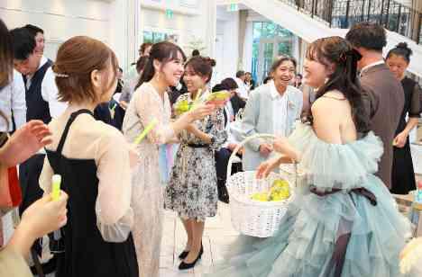 ふわふわの淡いチュールドレスにお色直しされた新婦様♡カラードレスの色当てクイズも催されたお色直し入場は、歓声と共にゆっくりと大階段からの登場でした♪ 当選された方へのプレゼントと言えば、抽選で数名の方に贈られることもありますが、おふたりは当選者全員分のプレゼントをご用意!歓談も交えながらゲストの方々と楽しそうに交流されておりました♡