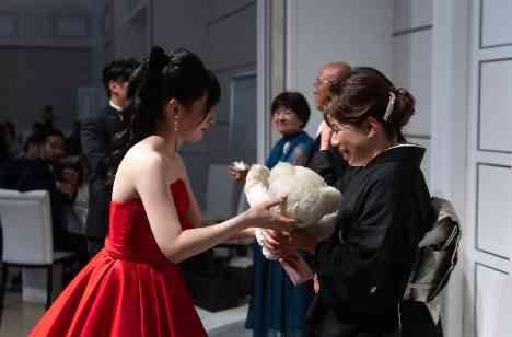 ご披露宴のフィナーレが近づくと、先ほどまでの賑やかな雰囲気とは変わって、親御様へ感謝の想いを伝えるお時間へと移ります。記念品として贈られたのはお花束とウェイトベア。生まれた時の体重と全く同じ重みで作られたぬいぐるみと、生花の花束という特別な贈り物。この結婚式を新たな門出の日とし、これまでの感謝とこれからもよろしくお願いしますという想いを込めてお贈りになりました。